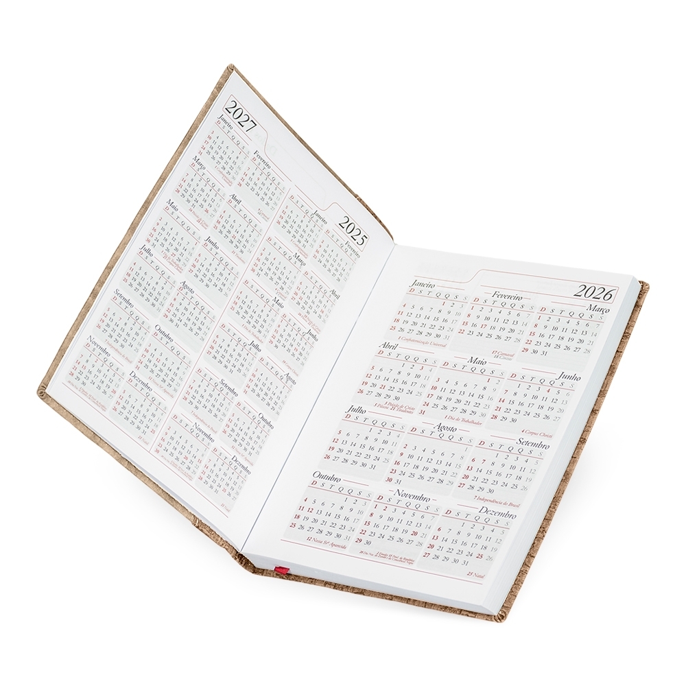 Além do visual sofisticado, a Agenda Diária 2026 conta com calendários de 2025 a 2027 e espaço para planejamento diário. É ideal para manter todos os compromissos organizados e facilmente acessíveis.