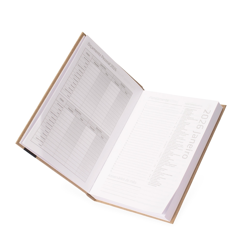 Seja no ambiente corporativo ou na vida pessoal, a nossa Agenda Diária 2026 é a escolha ideal para quem busca organização e praticidade. Com um design elegante de capa em kraft, ela atende perfeitamente às necessidades de funcionários do setor de marketing em grandes empresas que buscam brindes corporativos significativos.