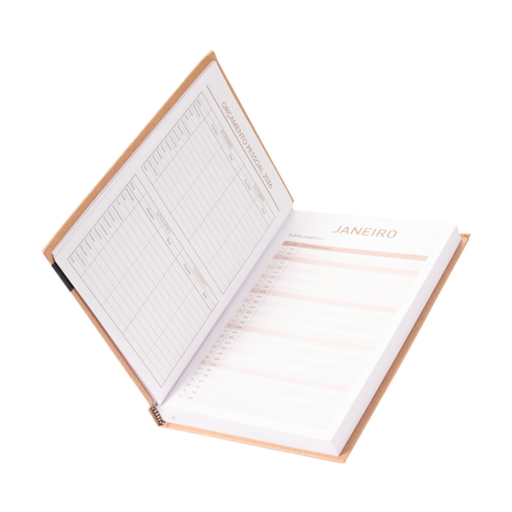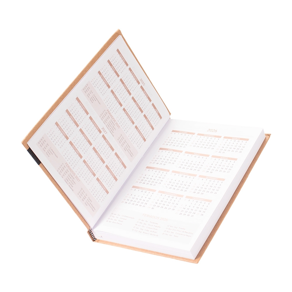 A AGENDA DIÁRIA 2026 é perfeita para profissionais do setor de marketing que buscam um brinde corporativo funcional e estiloso. Com capa dura em kraft e um elegante marcador de fita de cetim, ela não apenas organiza, mas também impressiona seus clientes e colaboradores.