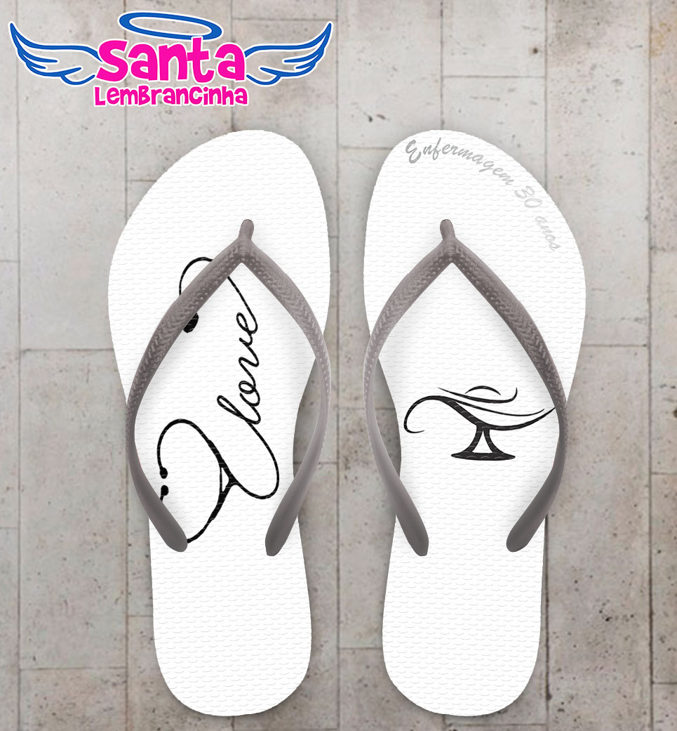 - ✔ Chinelo personalizado produzido em borracha na cor branca.